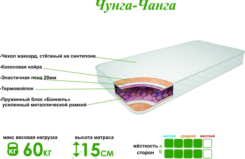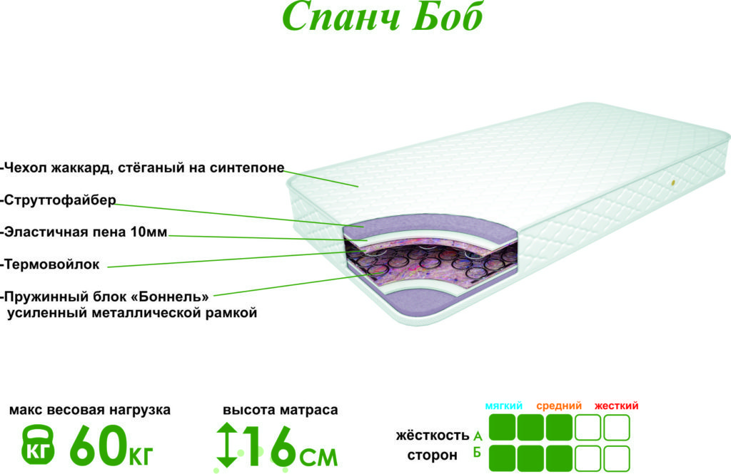Матрас “Малыш” разработан специально для комфортного и здорового сна вашего ребенка. Основой матраса служит классический пружинный блок Боннель, который обеспечивает надежную поддержку позвоночника и способствует правильному развитию осанки.